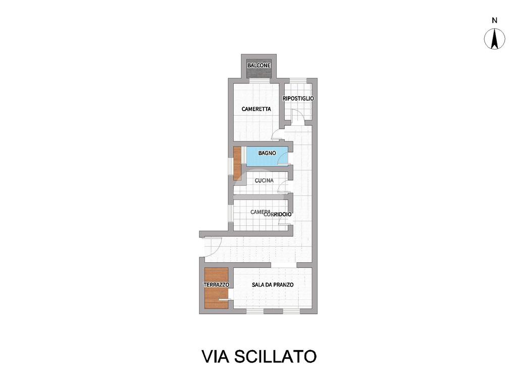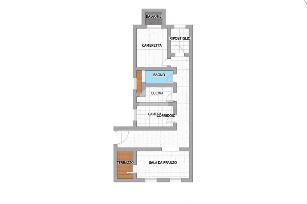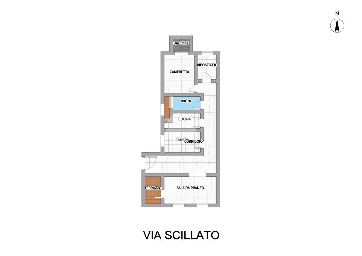 L’ingresso si apre su un disimpegno che conduce, sulla destra, a un accogliente sala da pranzo reso particolarmente luminosa dalla presenza di due ampie finestre. Dal soggiorno si accede a un terrazzino di pertinenza, ideale per momenti di relax, dal quale una scala in ferro permette di raggiungere il terrazzo condominiale. Proseguendo sulla sinistra del disimpegno si apre un lungo corridoio che distribuisce tutti gli ambienti della zona notte e di servizio: una camera da letto matrimoniale finestrata, una cucina abitabile con veranda, un bagno finestrato dotato di vasca, una cameretta con balcone che si affaccia sul retroprospetto e, infine, un comodo ripostiglio.