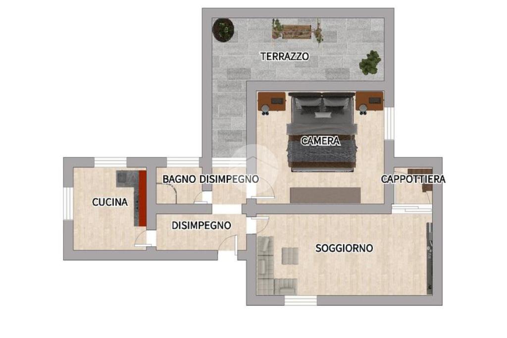 Dalla porta d’ingresso si accede a un comodo disimpegno, che introduce nella zona giorno, composta da un ampio e luminoso soggiorno con cappottiera e una grande finestra che dona luce naturale per tutto il giorno. Adiacente al soggiorno si trova la camera da letto matrimoniale, anch’essa finestrata e ben arieggiata. Il bagno, moderno e curato nei particolari, è dotato di box doccia. Da una porta finestra si accede al terrazzino, rappresenta un piacevole spazio esterno dove rilassarsi o godersi un momento all’aria aperta. Completa la proprietà una cucina non abitabile, con doppia finestra su prospetto laterale, che rende l’ambiente luminoso e pratico.
